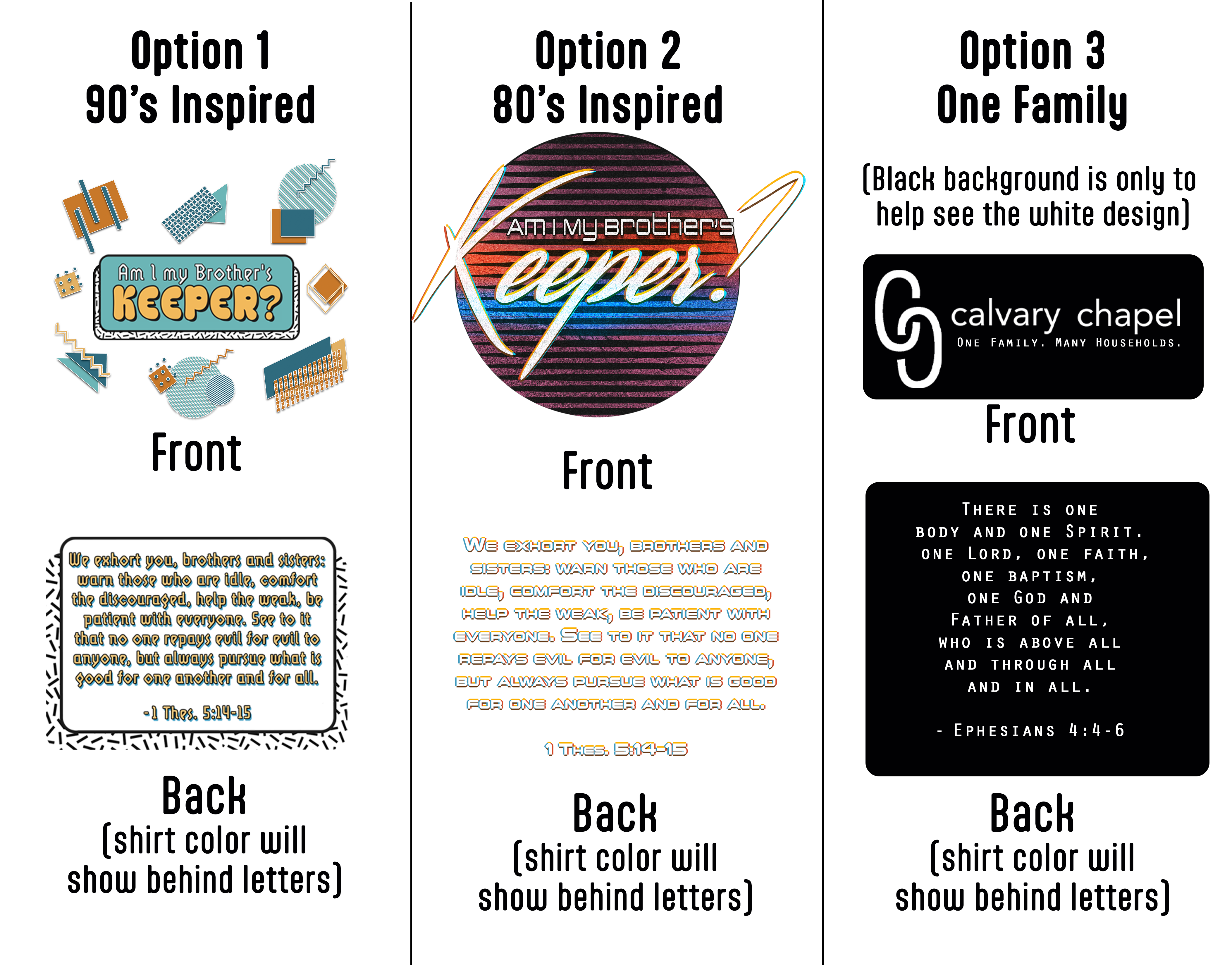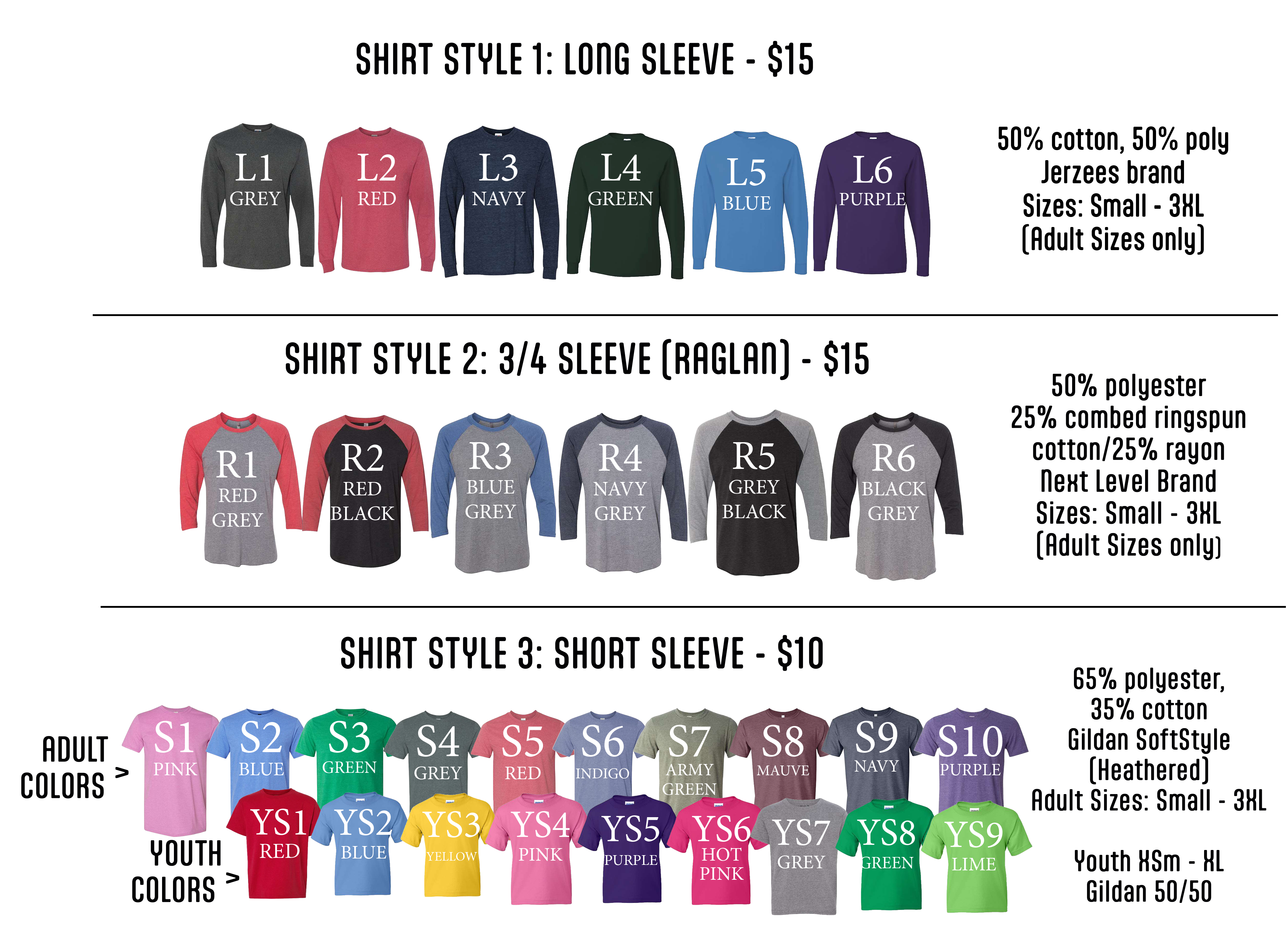 Be sure you include all 4 elements for each shirt you would like. (Design Style, Shirt Style, Size, and Color Code)